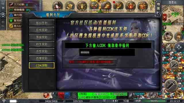 兌換方(fang)式(shi):点击(dianji)上方的福利(fuli)大(da)厅(ting),进入后选择(hoose)CDK领(ling)取,输入礼包码即可(jike)。