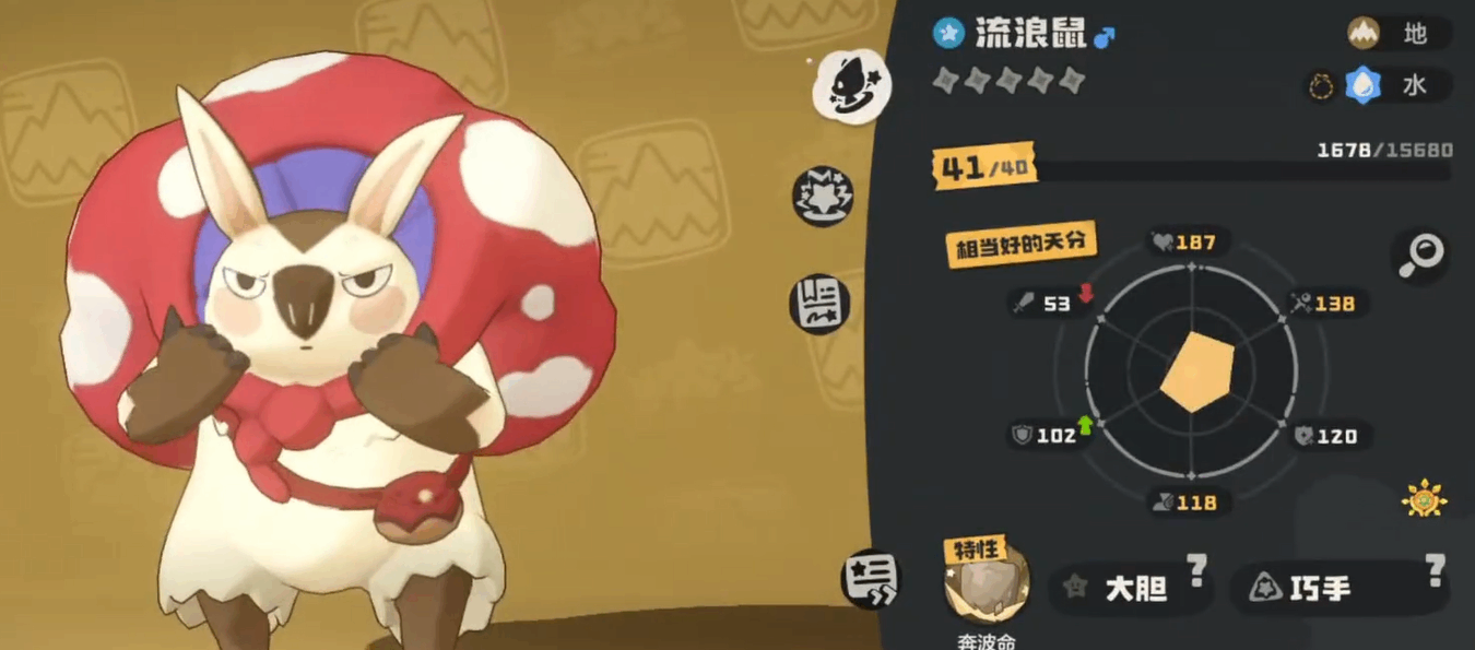 培养建议方面,若以功能(Function)定位为主导,推荐采用轻量化养成策略:集中资源达成进化门槛(當湔版本设定为42级+亲密度满值),後續无需投入大量精力强化战斗属性。进化完成后,流浪鼠即可稳定承担双职——日常(chang)快速位移与高效率资源搜寻。若玩家倾向尝(chang)试其战斗潜力,需注意(yi)地系阵容中存在多项数值更优的替代选择(如掘地鼠、岩崩鼠等),故非必要不建议深度培养战斗向配招与个体值。