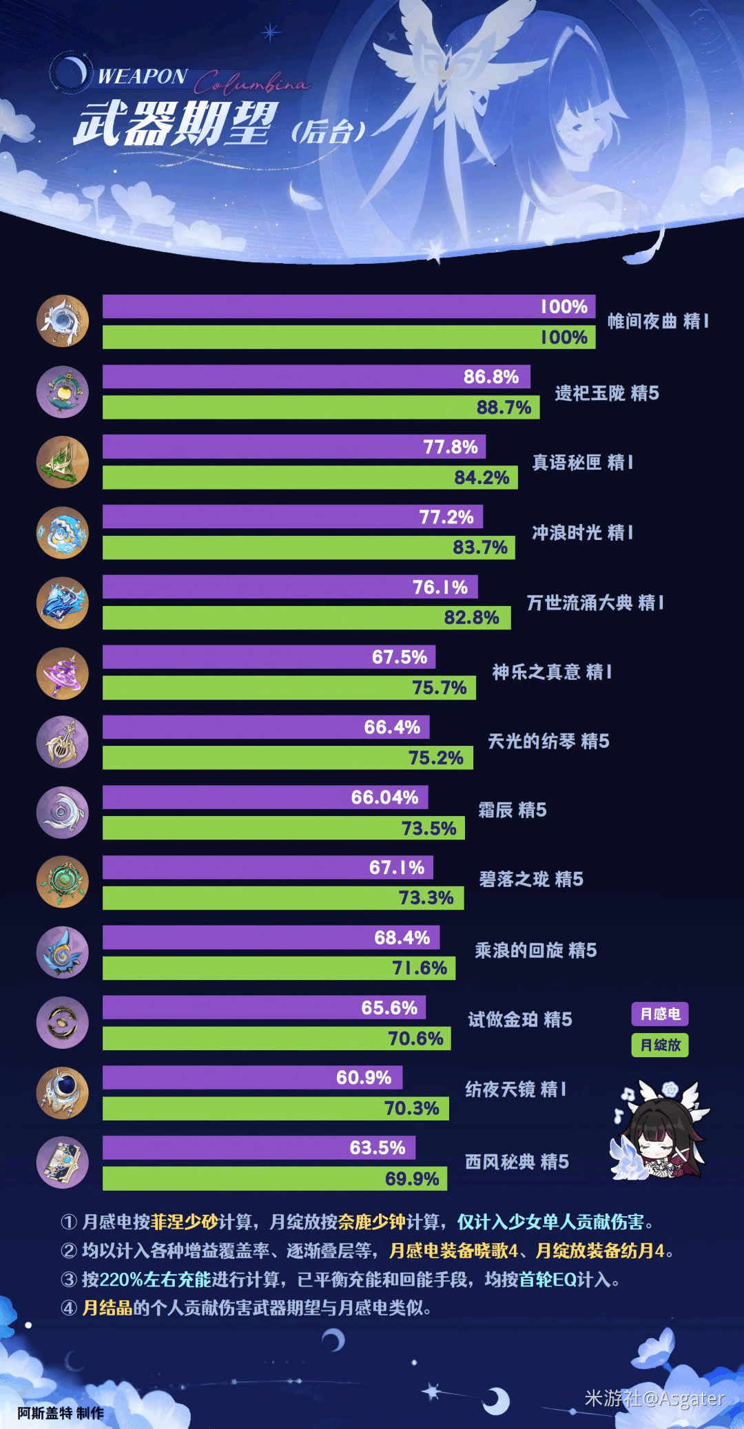◆ 虽然少女主打月反应伤(shang)害,但精通荍谥不高,通常不推荐精通法器(如千叶、寝正月、祭星者、纺夜天镜等)。不同月反应队中的武器表现(xian)大同小异,主堆双暴、生命和充能。