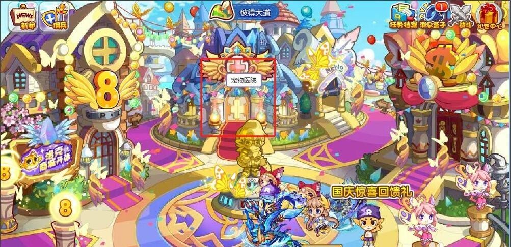 洛克王国游戏里面的宠物医院位置介绍:点击上面的地图;然后在地图上选择彼得大道;来到彼得大道后点击进入宠物医院,医院里面可以给宠物回血。