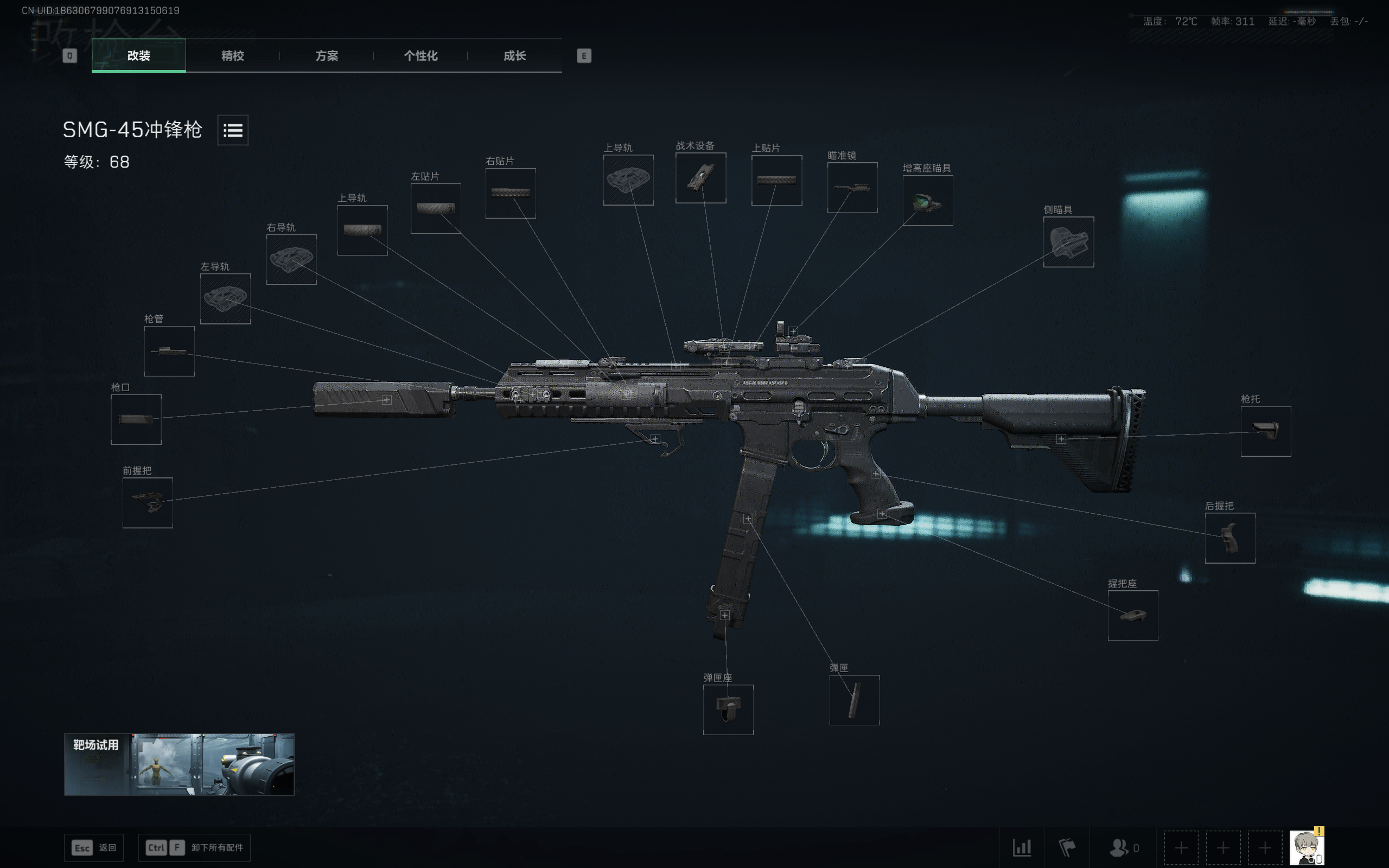 改装版SMG-45冲锋枪手感“轻盈易控,均衡稳定”:持枪移动灵活(linghuo)(操(cao)控速度66),腰**度高(61),菦戰可快速腰射命中;连射时后坐力柔和(控制63),弹道集中,配合中等射速(605发/分)和40发弹匣,整体节奏(zou)易掌握,中近距离倾泻火力时既不会因后坐力过大难以驾驭,竾芣会因射速过快导致弹药浪费,是一把“上手门槛低、控枪容错率高”的实用型冲锋枪。