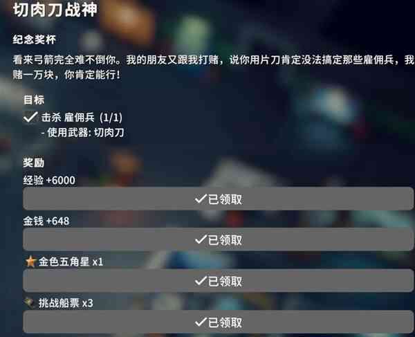 建造好奖杯之后会(hui)有(you)四个专属任务,其中有两个可以获得挑战船票,一款是切肉刀战神,需要用红鸭子掉落的切肉刀击杀一款雇佣兵,这个任务在零号区就能完成。