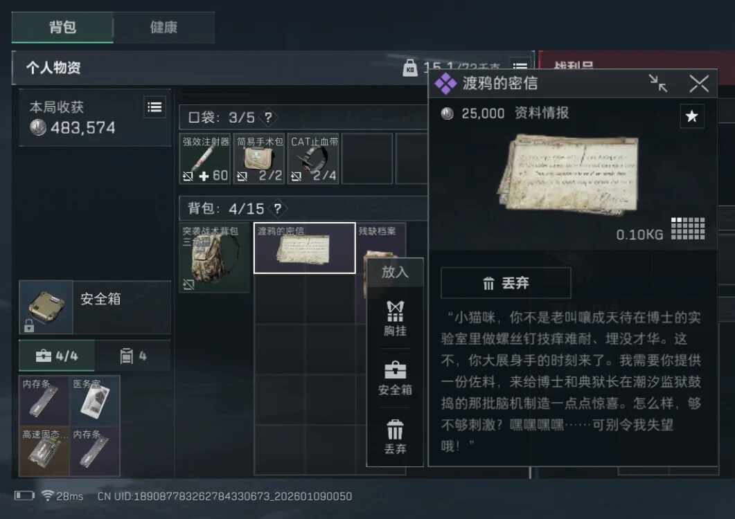 击败渡鸦信使后,其盒子必掉【渡鸦的密信】,价值(jiazhi)25000哈夫币!强烈建议保留,可能与后续限(xian)定(ding)高(gao)级奖(jiang)励(如“大红”) 相关联。