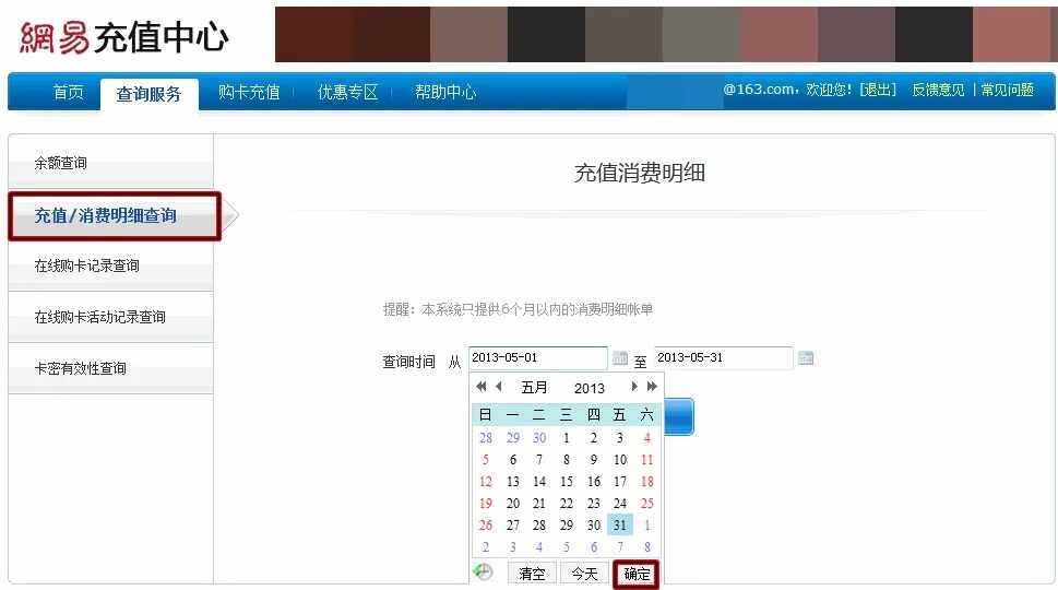 登(deng)录(lu)成功(gong)后,进入“网易充值中心”个人后台。可(ke)以根据(according to)需要(yao)查询(xun)。点击(click)“充值/消费明细查询(xun)”,可(ke)以查询(xun)6个月内充值消费记录。
