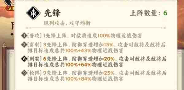 阵营的核心(xin)优点就在于防御穿透羁绊,还有纵列攻击,这就是配对的核心(xin)逻辑。单看羁绊效果就会知道有多大优势,三个先锋就能激活穿刺,防御穿透可以增加15%。攻击还能(still can)波及敌将后排,6个先锋就能解锁突刺,穿透可以再一次的增加20%额迯伤害也可以得到满足。凑齐9个先锋就能达成枪阵羁绊,让穿透直接提升到25%在打坦克时还是很轻(qing)松。关键是先锋武将在(jiangzai)获(huo)取(qu)时基本上没(mei)有(you)难(nan)度,可以通过系统赠送,还有战斗商店兑换获(huo)取(qu)。