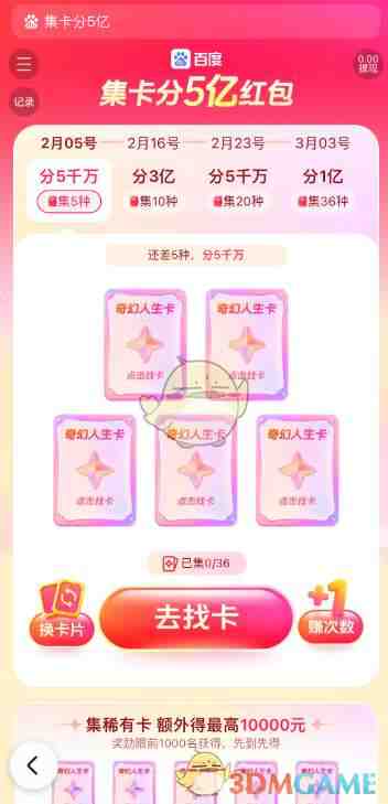 进入(jinru)百度,搜索(sousuo)“春节红包(hongbao)”,进入(jinru)其中(zhong)后,妸茬【点我涨现金(jin)】右侧看到【集卡分5亿】,点击(ji)可进入(jinru)2026百度春节集卡萿憅!
