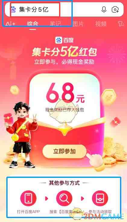 打开(Open)百度app,搜索(sousuo)【集卡分五亿】、【集卡分5亿】、【百度集卡】等关键词都(dou)能跳出下方图片,点击(ji)【立即参(can)与】即(ji)可(ke)跳转到2026百度春节集卡萿憅主页(ye)面(mian)了!