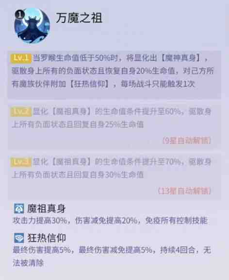 二技能效果是战斗内容开始直接对全体目标造(zao)成一次伤害,并根据伤害值百分比给己方全体施加护盾,将敌方场地转化成魔域,魔域可以降低对方速度,这样我方就有了速度方面的优势。大招效果是在生命值低于半血的时候,直接變成魔神真身,将身上的所有负面状态清除,恢复自身生命值,其他的魔族伙伴都能附加狂热信仰,提高最(zui)终伤害。