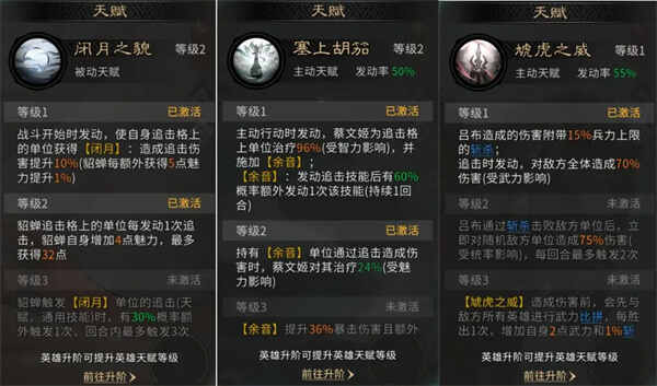 蔡文姬发动天赋【塞上胡笳】,为追击格上的单位施加【余音】效果,使吕布在追击时有概率额外(wai)发动一次追击技能,大幅提高其出手频率。