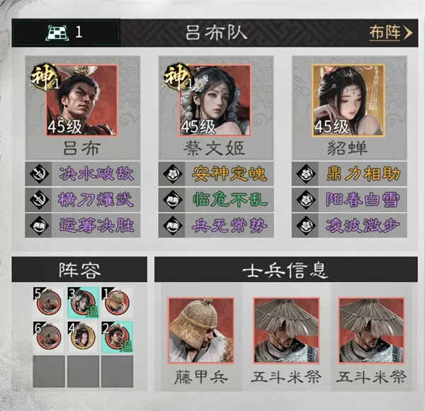 蔡文姬:主动技能固定携带【安神定魄】,可为追击格上的单位驱散负面状态,有效保障吕布的输出稳定性。