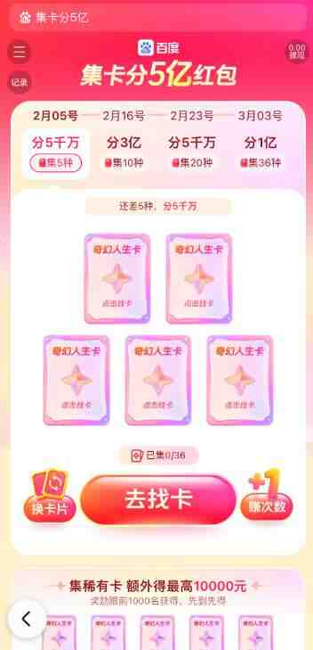 2026百度春节红包入口前1000名集齐5张稀有卡可赢最高万元现金;每晚20点还可通过文心助手猜口令抢隐藏红包,下面有更多的内容等你来看。