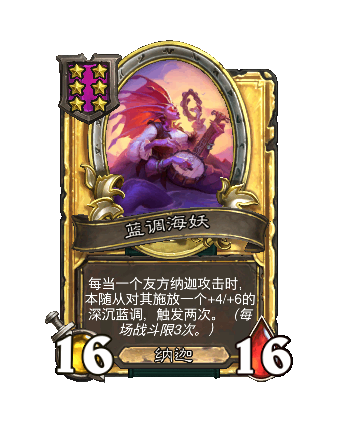 改动后:每当一个友方纳迦攻击时,本随从对其施放一个+2/+3的深沉蓝调。(每场战斗限3次。)