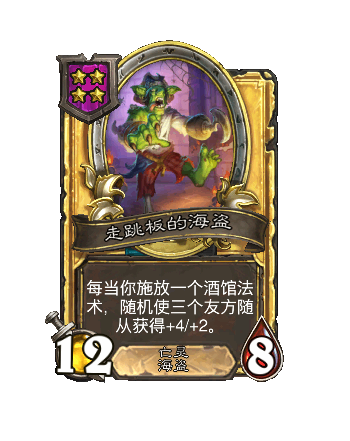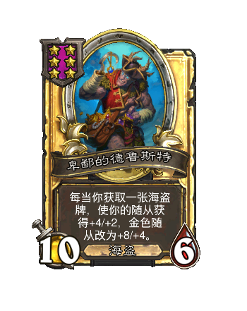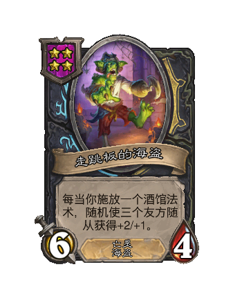 改动前:6/4。每当你获(huo)取(qu)一张海盗牌,使你的其他随从获得+1/+1,金色随从改为+2/+2。