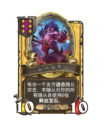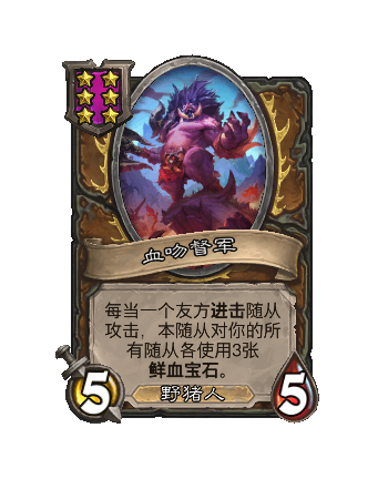 改动后:5/5。每当一个友方进击随从攻击,本随从对你的所有随从各采用3张鲜血宝石。
