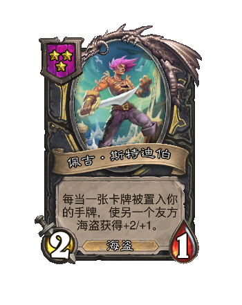 改动前:3/2。每当一张卡牌被置入你的手牌,使另一个友方海盗获得+1/+1。