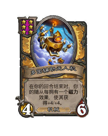 改动后:4/6。在你的回合结束时,你的随从每拥有一个磁力效果,使其获得+4/+4。