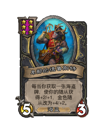 改动后:5/3。每当你获(huo)取(qu)一张海盗牌,使你的其他随从获得+2/+1,金色随从改为+4/+2。