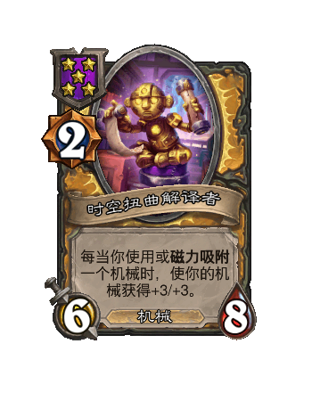 改动前:5/7。在你的回合结束时,你的随从每拥有一个磁力效果,使其获得+3/+3。