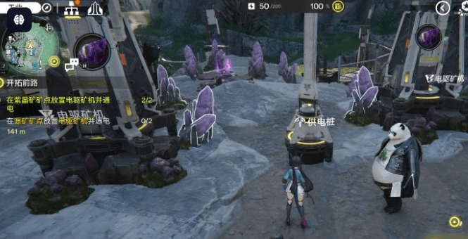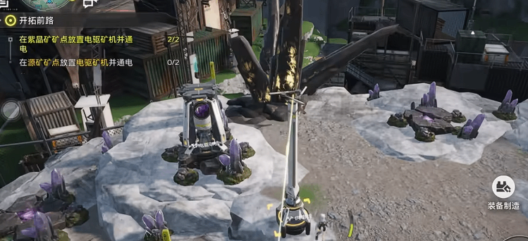 在紫色光芒笼罩的矿点区域放置电驱矿机,每个(ge)矿点可放置多台,建议集中布局以便供电桩高效覆盖。