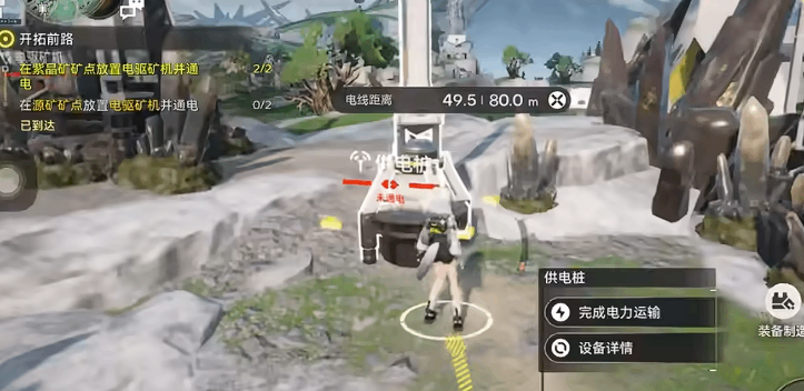 最后一座中继器需与矿点附近的供电桩保持80米内距离,点击(dianji)“开始电力运输”完成连接。