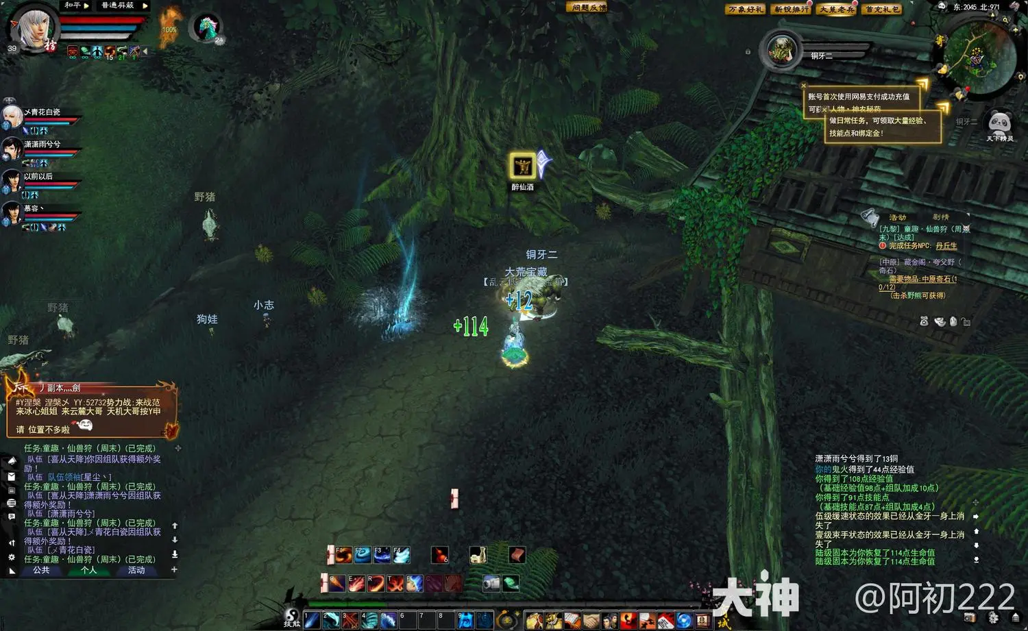 “1、2、3”的人分别去对应拱天猪的位置。分别对三只猪使用道具“醉仙酒”,召唤出队伍专属的拱天猪。