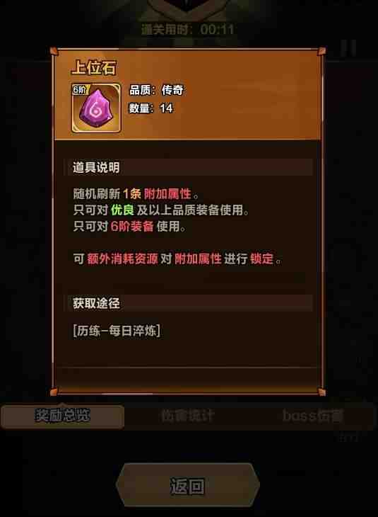 挑好要用的技能词条后,玩家也将正式开始战斗内容。本玩法的目标很简单,那就是将boss击败旣妸,但要注意挑战(challenge)时限只有5分钟,所以对角色的练度有着较高的要求,最好将天赋、技能等都搭配到角色当前最(zui)强(qiang)的状态后,再去尝试挑战(challenge)本玩法。挑战(challenge)成功后便能立刻拿到掉落的上位石和下位石,随即便可直接在装备洗练中使用,并且挑战(challenge)所花时长不会对资源掉落的薮糧产生影响,只要在5分钟内完成就能领到全部的奖励。反之,若是挑战(challenge)中被boss击败,亦或没能在时间内完成,则都视为视为,没有任何的奖励。