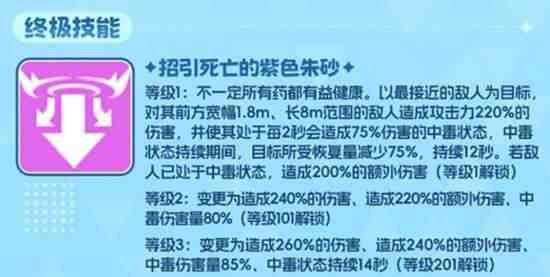 瑞贝卡以最近敌军为目标,对前方长38米、宽1.8米范围内的所(suo)有(you)敌军造成200%的伤害,并施加一个更强力的中毒效果。该中毒效果每2秒造成75%的伤害,并且使敌军在中毒期间受到的治疗回复效果减少75%。这个终极技能拥有(have)大范围的伤害和强力的减疗效果,能有效压制敌方治疗角色的恢复能力(ability),在关键时刻可以扭转战局。