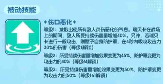 当瑞贝卡使用技能时,会使所(suo)有(you)敌军受到的伤害增加40%。如果瑞贝卡进行了①佽额外攻击,她自身会获得一个持续4秒的护盾,该护盾可以吸收相当于敌军攻击力30%的伤害。这个被动技能能有效放大队伍的整体输出(chu),尤其是配合(Cooperate)她自身的挂毒效果,能让中毒造成的持续伤害得(de)到大幅提升。