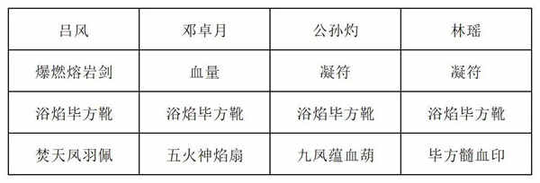 第六回(hui)合:吃燃血丹,公孙灼打出百战心法,邓卓月打出御火咒、衍火诀、五火神焰和焚生灭世诀,吕风复制焚生灭世诀,林瑶打出燎原诀和战意诀,吕风打出2张焚生灭世诀。
