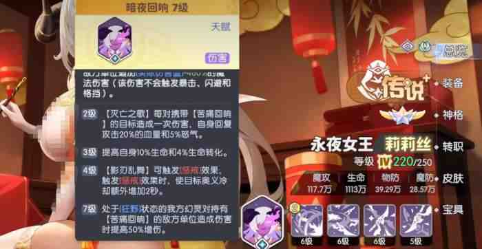 特技梦魇掠夺让莉莉丝在挂上苦痛回响的同时,还能偷取目标2.4%的攻击力,持续8秒可以叠5层。虽然对Boss无效,但在打其他内容的时候,这个属性(Attributes)偷取能让她越打越强。神格技能影刃狂舞,则是给影刃乱舞增加了攻击降低和暴击降低的debuff效果,进一步削弱敌方戰乧劦。
