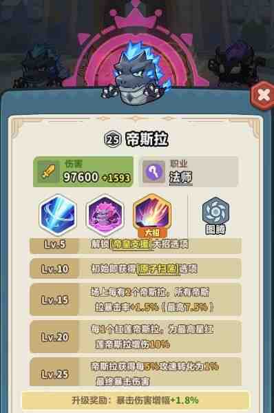 Lv15 每2个帝斯拉增加1.5%暴击率(最高7.5%),搭配法师自带5%暴击,总计12.5%