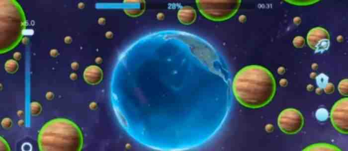 当靠近那些比自己小的星球时,引力会自动把它们吸过来,然后就被吞掉了,自己的体积也跟着变大。但是(shi)要特别小心那些大块头,看到比自己大的赶紧躲开,不然就变(bian)成别人的食物了。所以判断星球大小,保持距离这个事情真的挺重要。