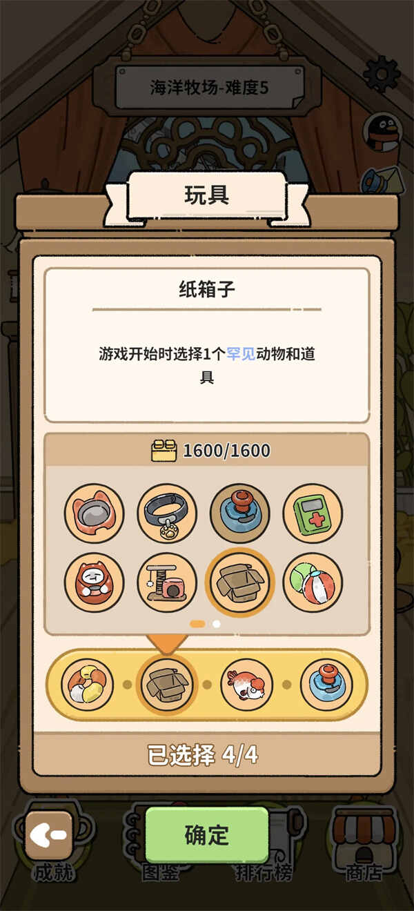 我们选 纸箱子(必选,开局选蚁后),仿身鱼(增加开局效率),伊丽莎白圈(+20罐头,但你的罐头没有利息了。用于第一轮移除障碍和其他动物),剩余1个选圉運按钮或者其他都可以。
