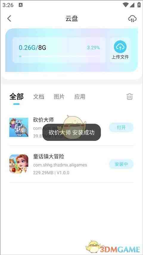 1、用戶打开小滴云手机app,首先可在设置中上传游戏并安裝成功;