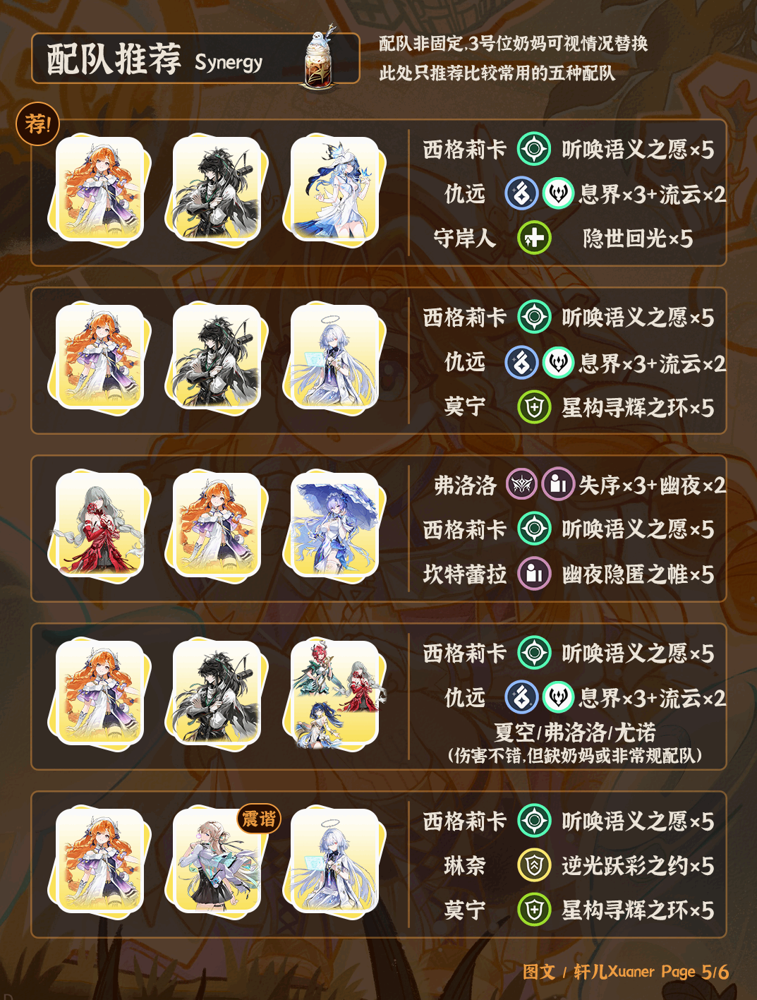 ⑤西格莉卡是声骸主C。从配队角度(angle)来看比较(Compare)刚需仇远,与其他角色搭配效果一般(generally),所以尽量西格莉卡要和仇远一起抽取。西仇的伤害也非常高,低链投资不亏。理论西仇+夏空伤害最高,但没有奶妈,西仇守是最好的搭配,守岸人换其他奶妈也可以,伤害低①點。实在不抽仇远的话最好进弗洛洛队,与夏空、琳莫也有搭配的可能,但伤害会差很多。