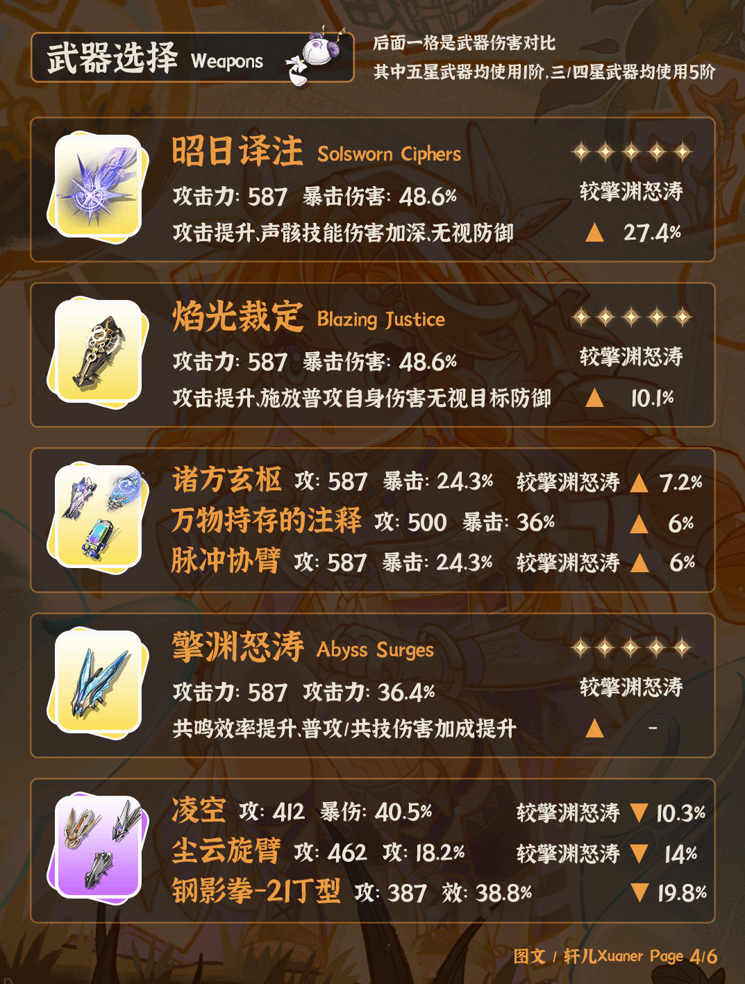④ 西格莉卡武器首选专武昭日译注。可以提供无视防御、声骸技能(neng)伤害加深。作为(as)主C专武比较(Compare)刚需,没有太好的下位替代武器。如果不抽专武可以考虑其它五星武器吃白值和攻击加成。