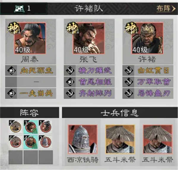 兵种站位:在周泰的下方放置一个西凉铁骑,在张飞与许褚身后各放置一(yi)名(ming)五斗米祭。