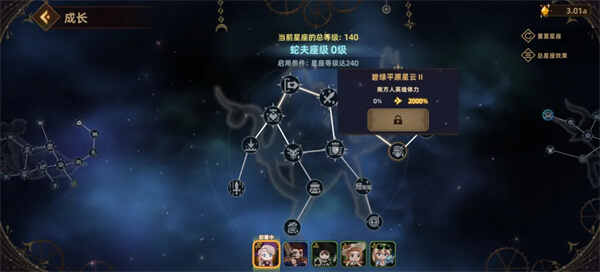 星座系统:咱们玩的是教主体力队,基本靠爱丽丝,体力咖荿主加点爱丽丝相关体力,多余的加点其他英雄体力,最終要加点到蛇夫座星座才行。