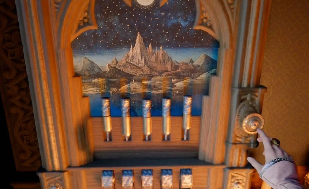 同样位于大宅内。谜题目标是将五根金属柱的分界线与底座的画面对齐。