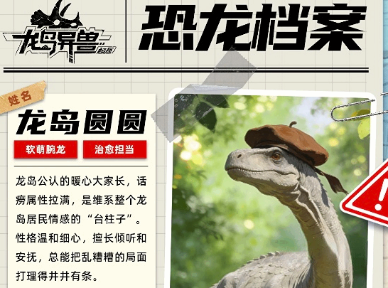 第二只强推的恐龙是龙岛圆圆,作为一只腕龙是团(tuan)队当中(zhong)的智力担当,也是每一个龙岛小伙伴公认的大家长,虽然(Although)具备话痨属性,但却是整个龙岛情感居民联系的台柱子,最擅长(chang)的(de)是与每只恐龙进行沟通,并且能够安抚倾听他们的心事,爱好就是收集地上可以发光的鹅卵石,在战斗过程当中(zhong)能够为团(tuan)队提供持续(continued)的续血量,保证整个团(tuan)队的续航时间。