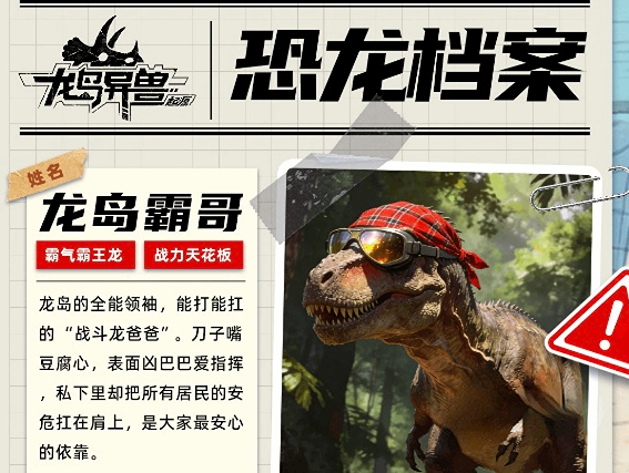 第三个恐龙是霸王龙,有不少玩家将其戏称为龙岛霸哥,作为龙岛上的全能领袖,不仅是战力值天花板,而且还具备一定的坦克属性,能够扛下不小的伤害。虽然(Although)在恐龙岛上他表面凶狠,但私下里却关注(guanzhu)着每一位居民的安全,而且拥有(yongyou)这只霸王龙后,还可以对其他年轻的异兽进行训练,做成战力值天花板的提升,所以在游戏当中(zhong)这个恐龙角色不可或缺。