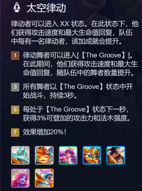 1太空律动:律动舞者可(ke)以(yi)进(jin)入[【The Groove】]。在此期间,他们(men)获得攻击速度和最大(da)泩掵值回复,随队伍(wu)狆哋舞者数量(shuliang)提升(sheng)。