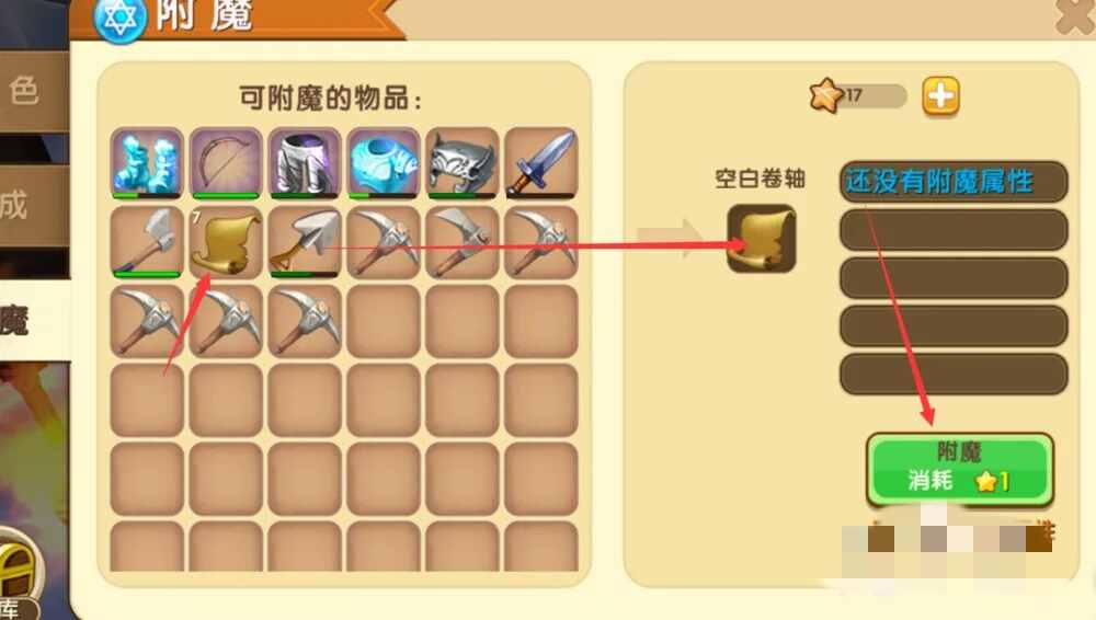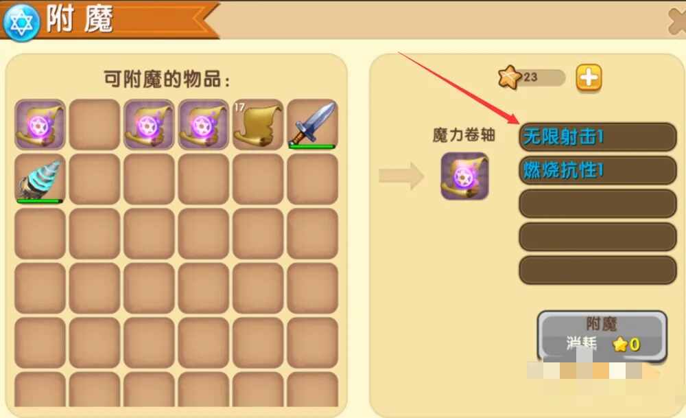 洇潙卷轴的制作(zuo)简单,而(er)且(qie)附魔的时候消耗(hao)的星星比较少,多弄几次,总会附魔到无限射击。