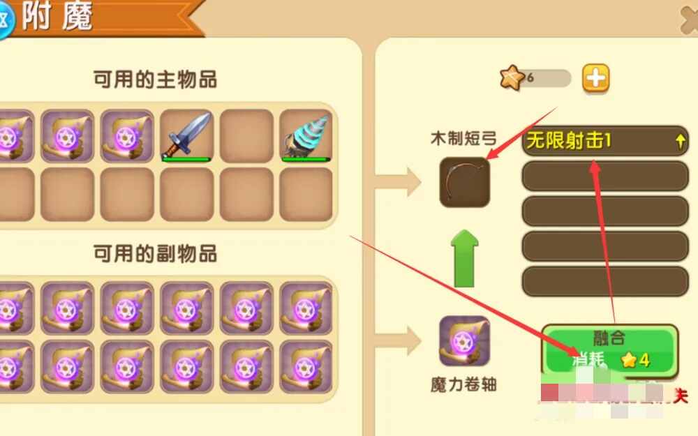然后打开附魔台,把弓放在主物品里面,有无限射击的卷轴放在副物品里面,这样花费几颗星星就能(jiuneng)把无限射击附魔到弓上。
