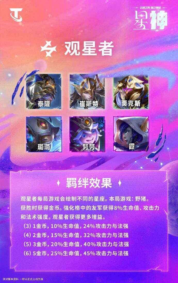 云顶之弈S17观星者羁绊效果教程在新赛季会增加很多新的羁绊和棋子,还有不少老羁绊,老英雄的回归,那么有不少小伙伴好奇有哪些羁绊效果,了解更多精彩快来看看下面的内容吧。
