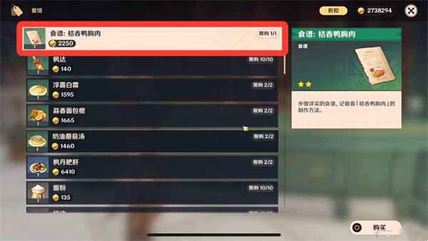 4、最後花费2250摩拉之后,就能成功(gong)的购买到这(zhe)个食谱了。