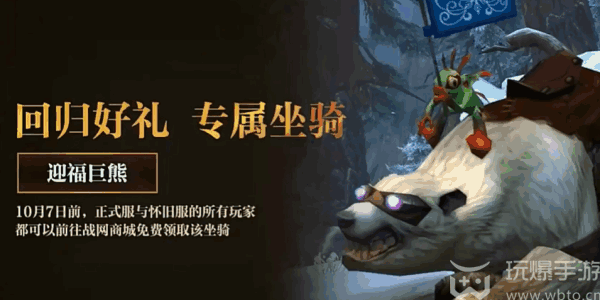 1、迎福巨熊:10月7日前,正式服与怀旧服的所有玩家(player)都可(can be)以前往(qianwang)战网商(shang)城免费领(ling)取该坐骑。