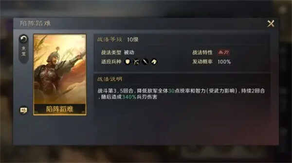【陷阵蹈难】战斗内容第3.5回合,降低(di)敌军全体30点统率和智力(受武力影响),持(chi)续2回合,随后造成(cause)340%兵刃伤害(harm)。