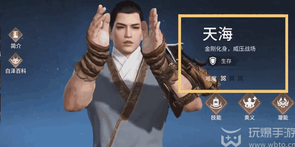 永劫无间手游天海技能介绍:天海:标签是生(sheng)存难度1颗星,其大招能变为巨大金刚的特点(features),所以在游戏中又被称为“头佛”。