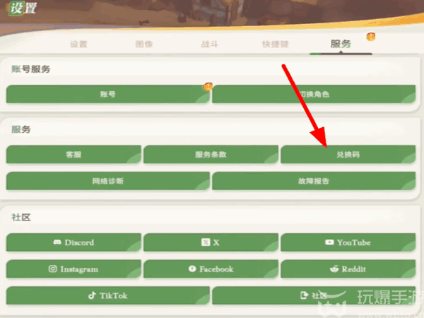 4、在服务页面就能看到(See)兑换码,点击进入(jinru)把兑换码输入进去。